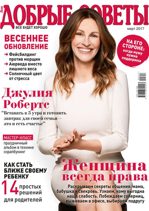 «Добрые советы» — это ежемесячный журнал для женщин. Его главные темы — секреты привлекательности, хорошего самочувствия, домашнего уюта и гармонии в отношениях с близкими. Каждый номер журнала открывает интервью со звездой — о ее личной жизни, профессиональных успехах, о доме, семье и детях. Журнал «Добрые советы» рассказывает обо всем, что интересует современную женщину. Стильные идеи и модные акценты. Новинки косметики. Меню здоровья и рецепты красоты. Дети и родители. Кошелек и карьера.
