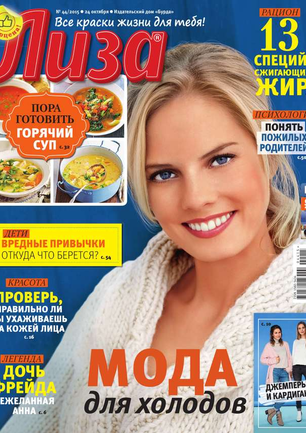 Самый популярный в России еженедельный журнал для молодых женщин «Лиза» стал еще интереснее, еще привлекательнее для читательниц. Теперь больше знаменитостей на страницах любимого журнала! Фитнес со звездой и звездный макияж, уроки стиля и самые горячие новости из жизни кумиров. А еще — модный шопинг, актуальная мода, новинки косметики и великолепные идеи для дома. Романтические истории о настоящей любви и рассказы читательниц о разных жизненных ситуациях. Аспекты психологии, секреты успешных отношений с окружающими и искусство сохранения любви.